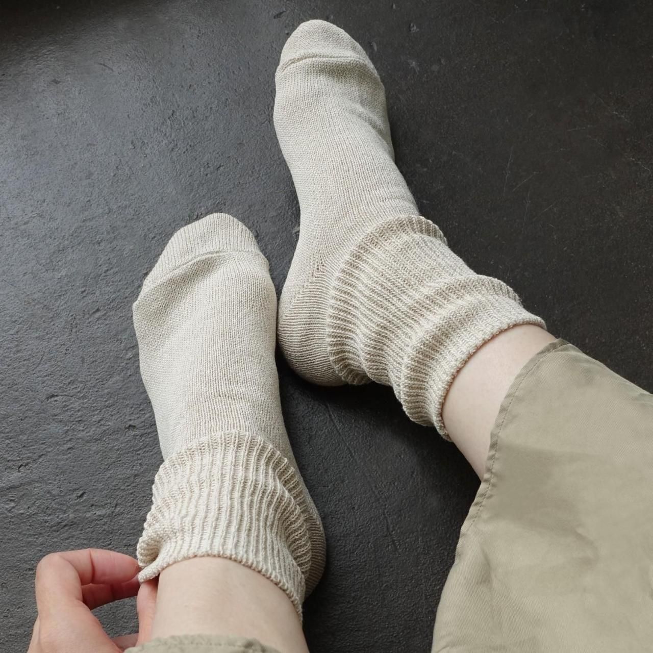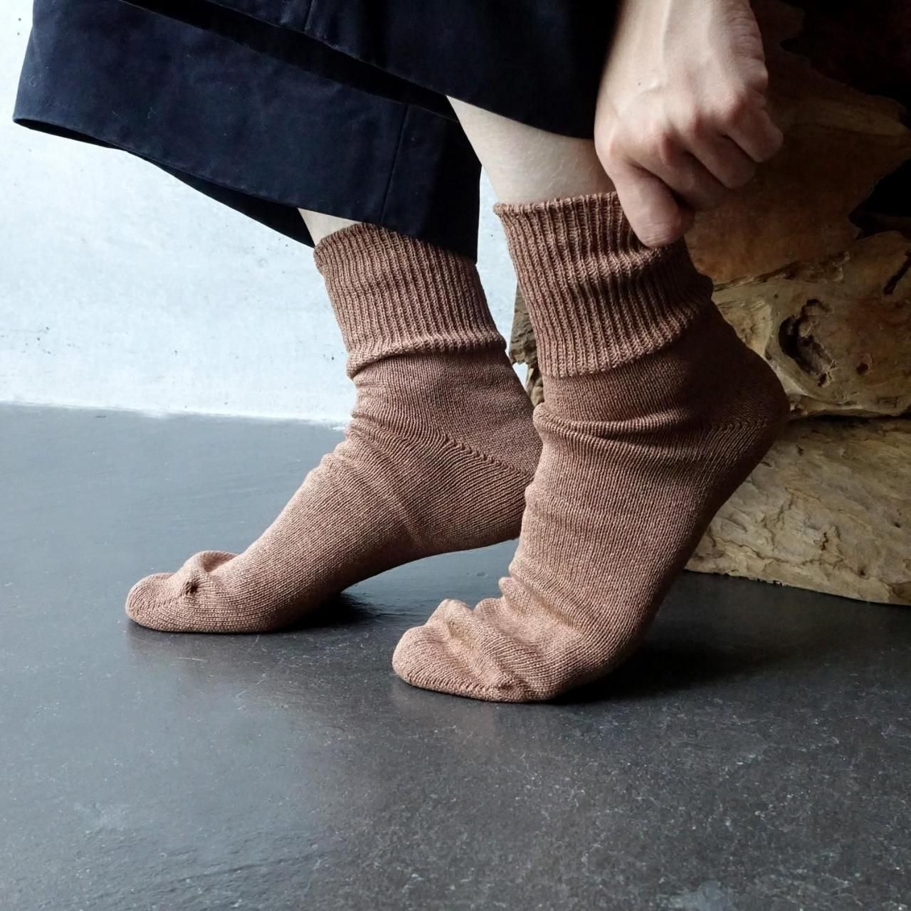 カジュアルソックスのイメージがつよいローゲージのくつ下ではなかなか使われることのなかった高品質の天然素材をたっぷりと贅沢につかい、丁寧にゆっくりと編みあげています。