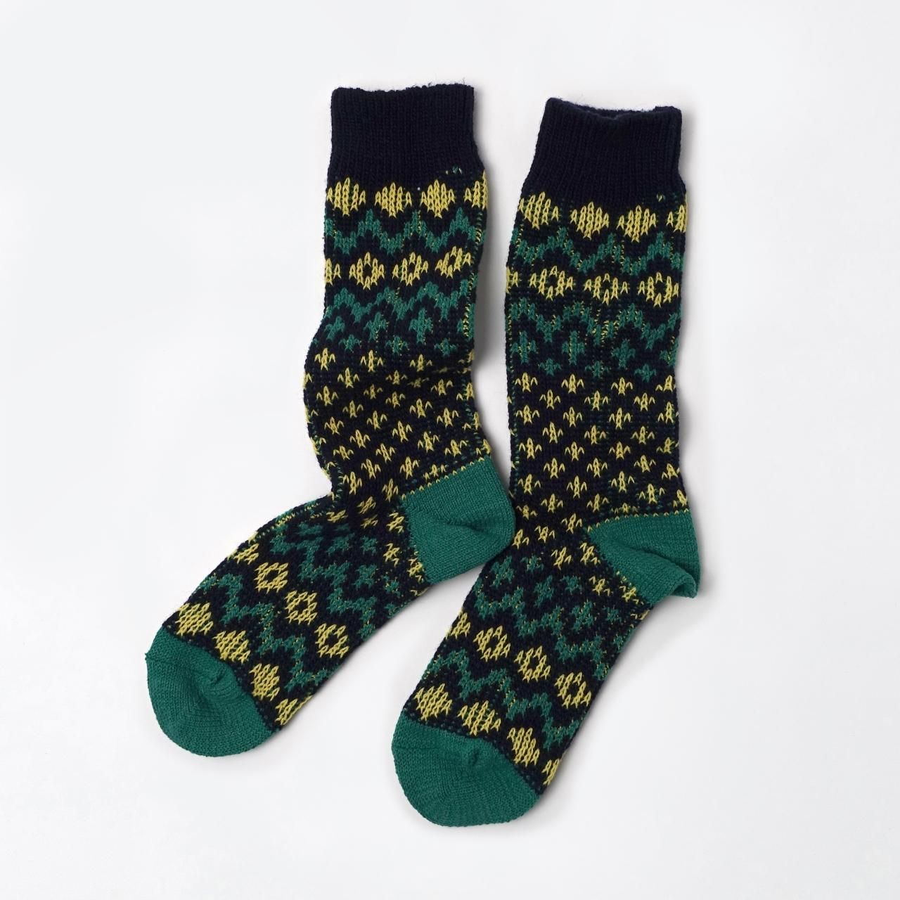 アップサイクルウールとリサイクルポリエステルを配合した柔らかな糸とリサイクルコットンの糸を一緒に編みあげたエコフレンドリーな暖かくつ下。軽さと保温性の高い素材の特性に加え、摩擦が起きやすいつま先とかかと部分をリサイクルコットンで編むなど、環境にやさしい素材というだけでなく、履き心地や耐久性にもこだわりました。希少なローゲージのジャガード機で編まれるノルディック柄は、まるで手編みのようなざっくり感のある表情。見た目も履き心地も暖かです。