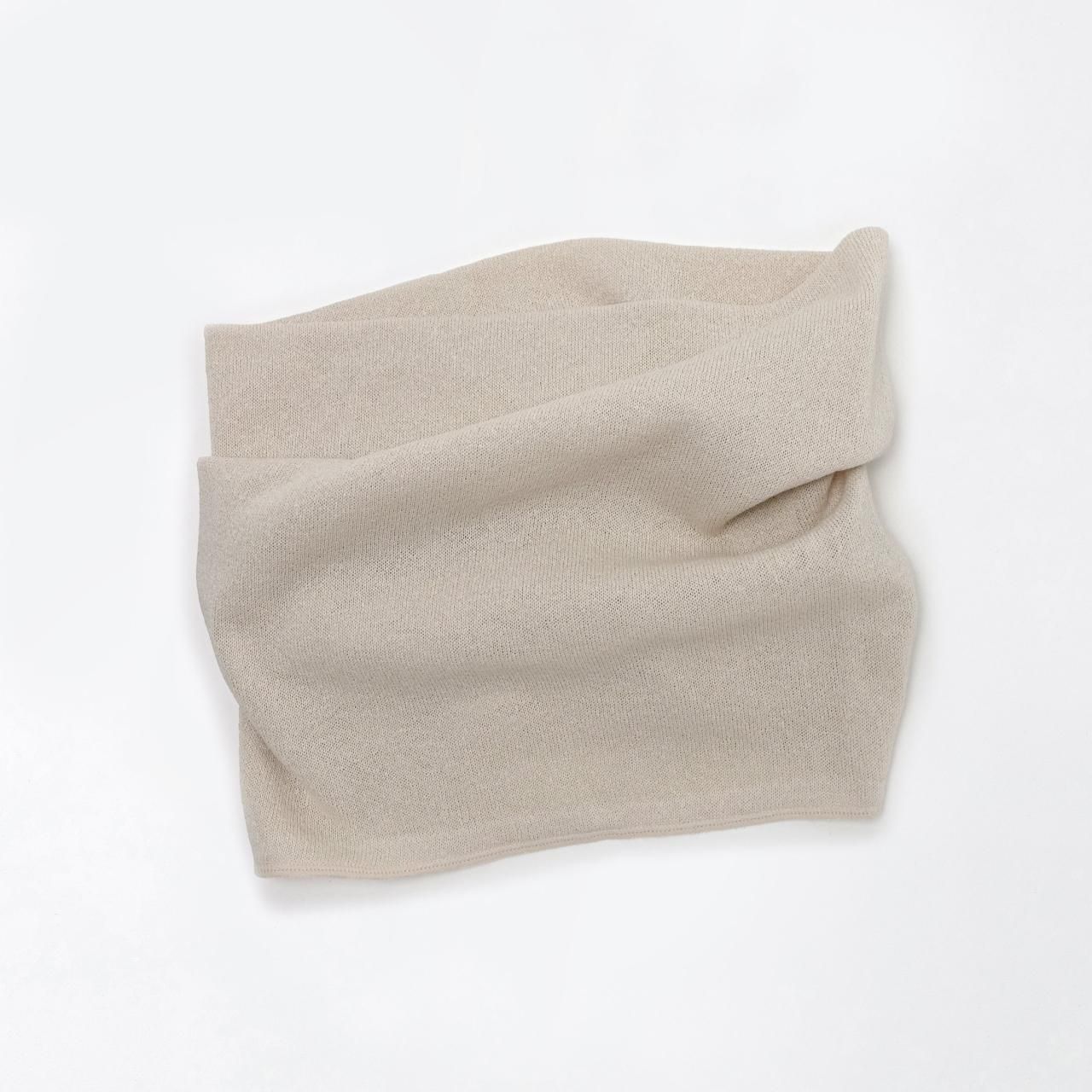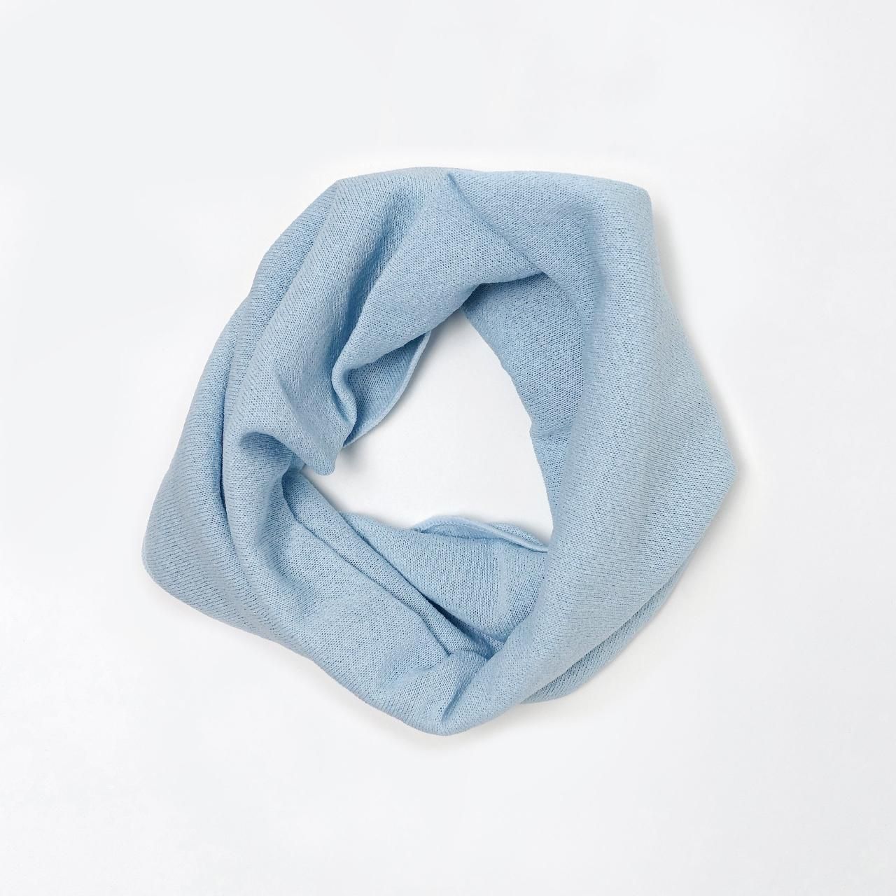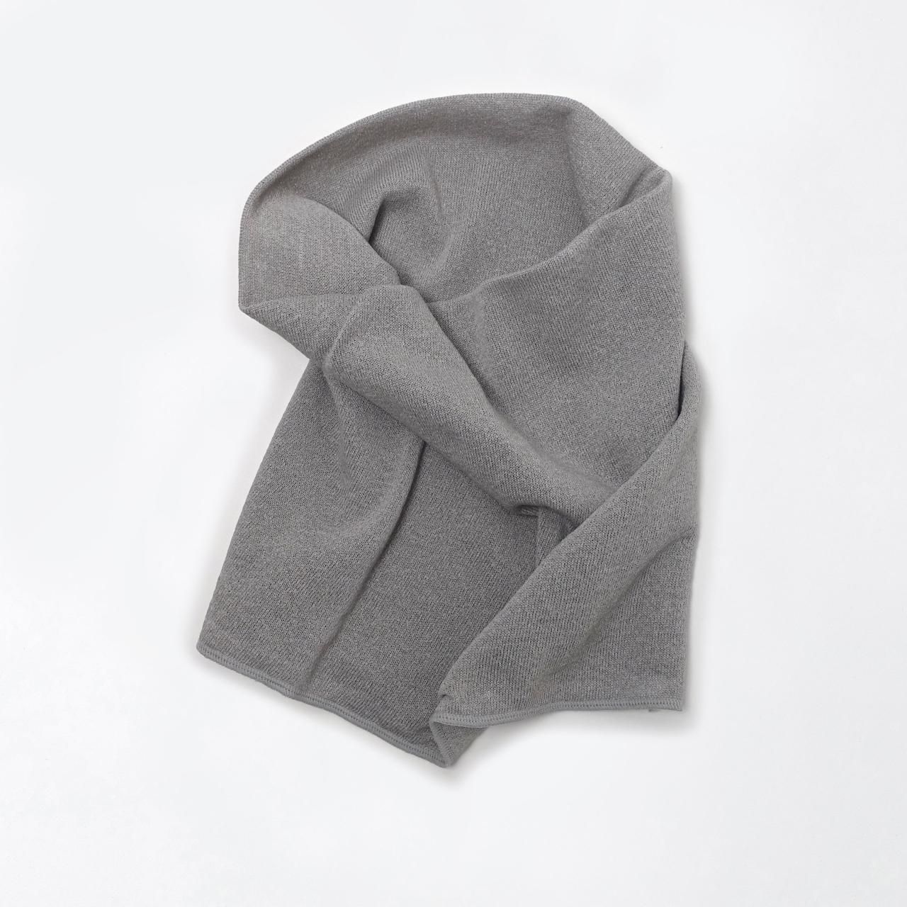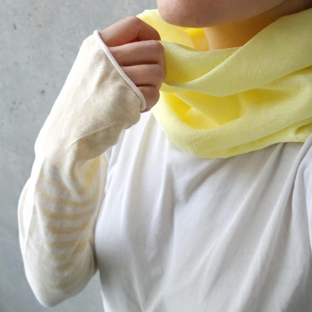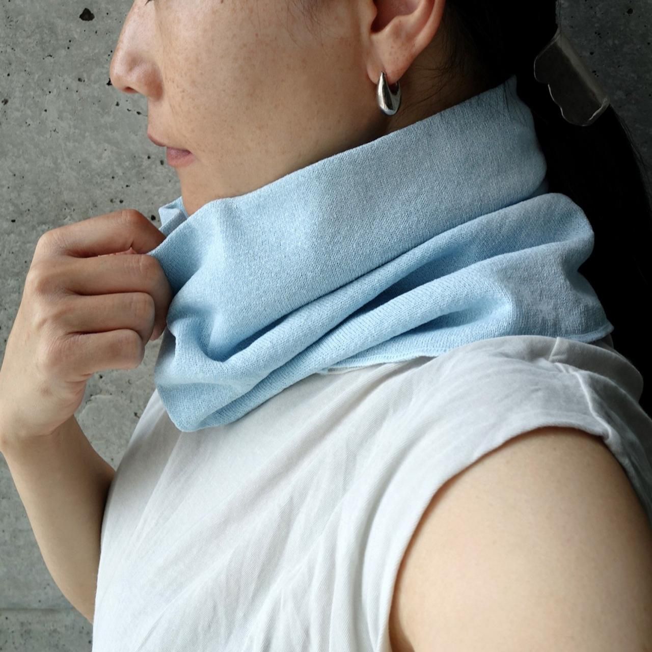 筒状に編んでいるので、さっと着けるだけで首元の紫外線対策ができます。ストールのように落としてしまう心配がありません。吸水速乾性に優れた和紙の糸と、UV防止効果と接触冷感効果のある糸を一緒に編んだ薄手の編み地は、1日中着けたままでも汗による不快感少なくお過ごしいただけます。