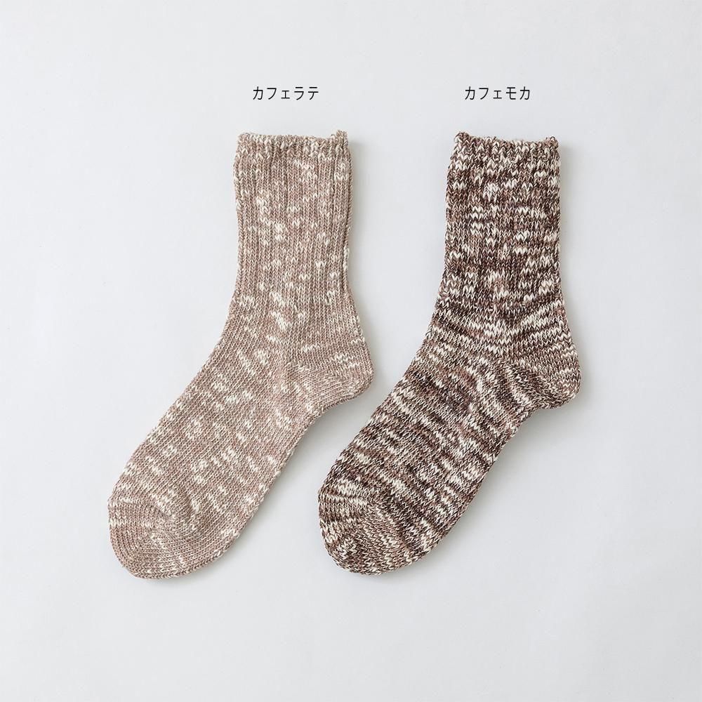 その掛け合わせた糸を、国内では希少となったローゲージ(目の粗い編み目)のダブルシリンダー機で、どっしりと編みあげた雰囲気のあるソックスです。